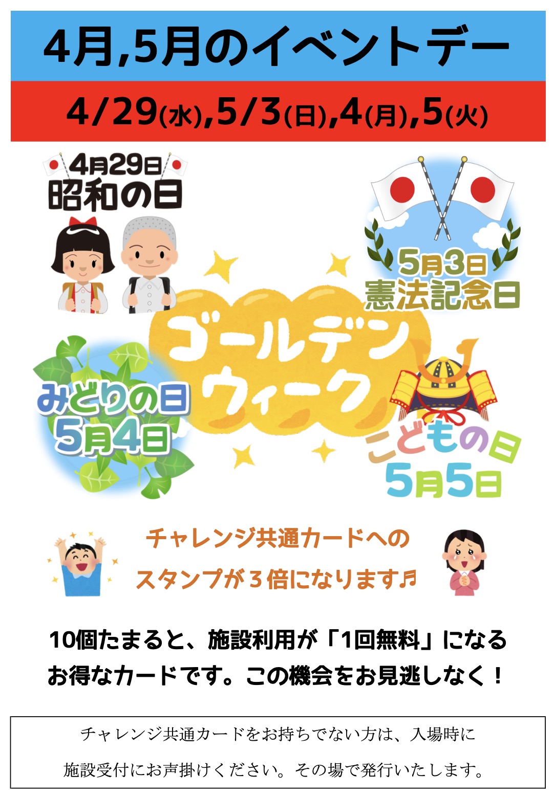 「ゴールデンウィーク」ポイント3倍デー(4/29・5/3〜5) | 小美玉市 小川海洋センター
