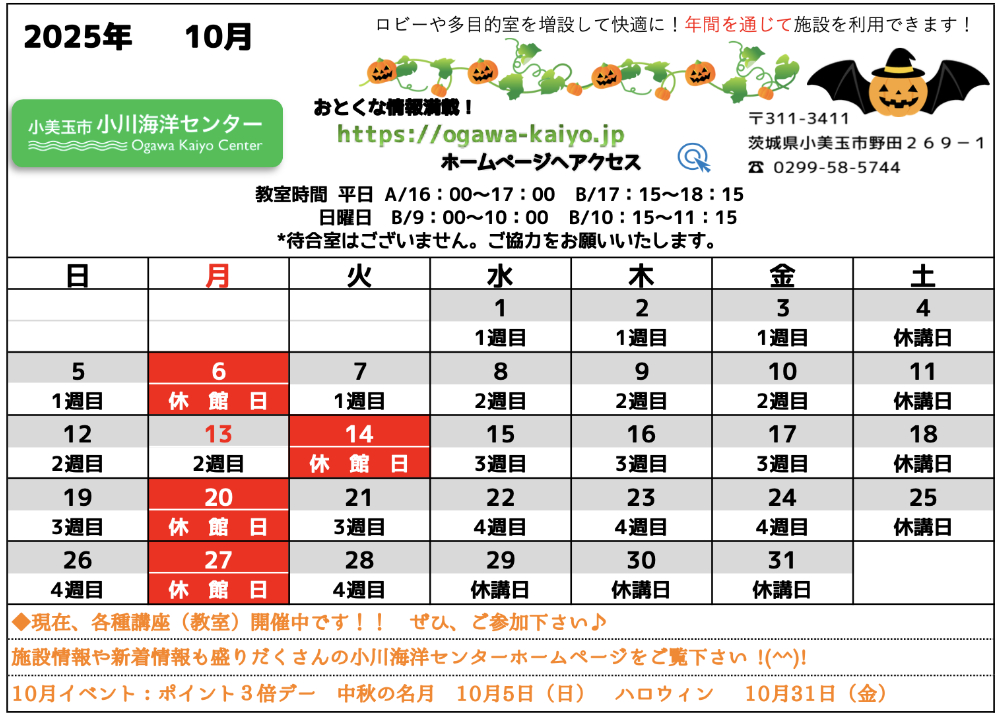 2025年10月の休館日・営業カレンダー(スクール)